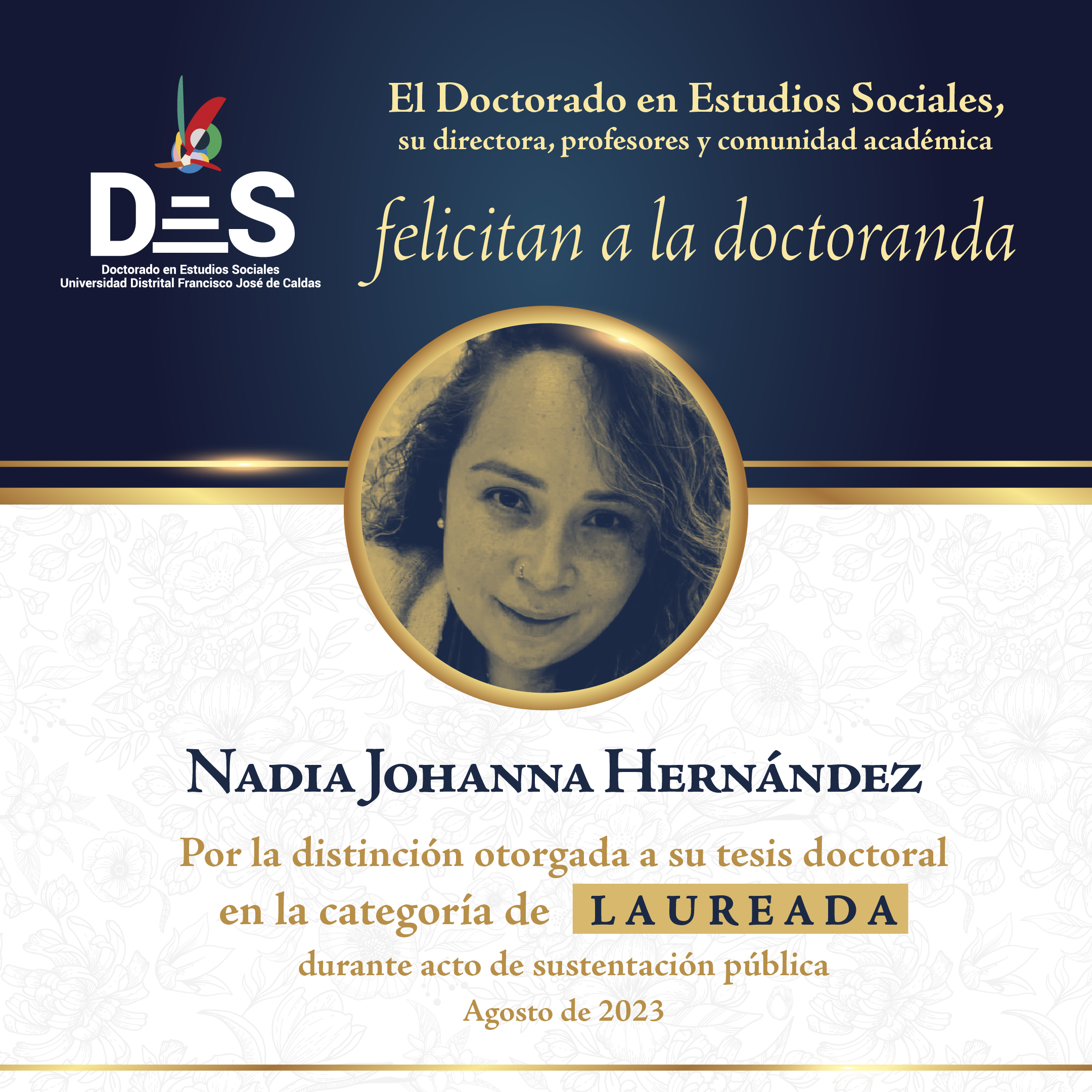 En representación de la comunidad de este proyecto curricular, felicitamos a Nadia por su dedicación y excelencia, un testimonio de nuestro compromiso con la investigación de calidad. ¡Enhorabuena por este logro!