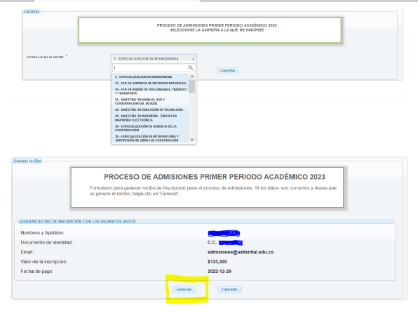 6. Seleccionar el Posgrado de su preferencia y dar clic en continuar, allí aparecerán los datos registrados y una opción que dice GENERAR, dar clip en esta opción y podrá descargar su recibo el cual puede ser pagado en cualquier sucursal del Banco de Occidente y/o realizar el pago en línea por PSE.