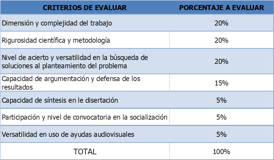 5. Una vez se termina la socialización los estudiantes y el público presente deberán retirarse para permitir que director y evaluador asignen la calificación.